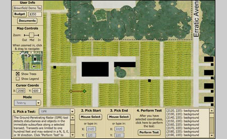 The field of play consists of a three dimensional world whose playing surface is 2200 x 3200 feet. This surface extends to a depth of 600 feet and consists of over 2 million data points that contain information on surface elevation, depth to water table or bedrock, and soil or sediment type. Students can utilize a host of tools including seismic reflection and refraction, ground penetrating radar, magnetometry and metal detection, soil gas, as well as groundwater and sediment sampling using drilling and push techniques. The playing field also includes a town complete with infrastructure (buildings, roads, wells, water towers, homes, businesses and residents) as well as a history and storyline. There is a municipal government complex complete with workers and officials and relevant historical documents and permits.